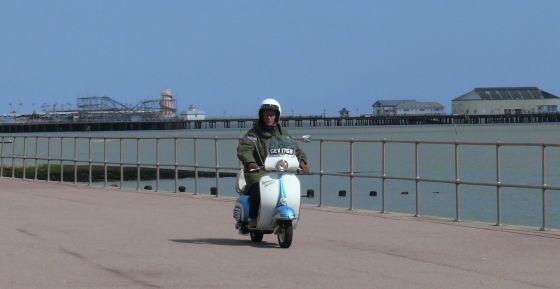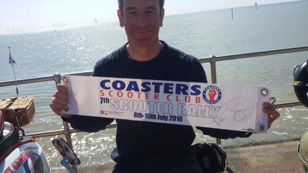 Robson participe cette fois à une course de scooters pour le tournage des TALES FROM THE COAST et se prépare au départ du Coaster Scooter Rally à Colchester.