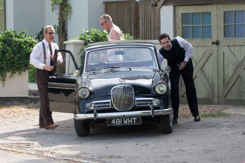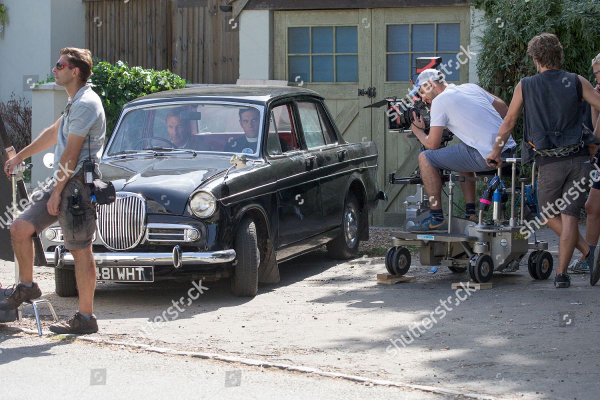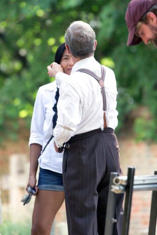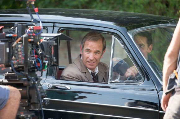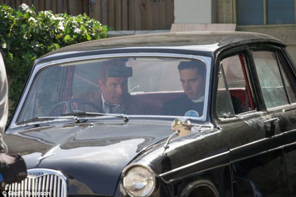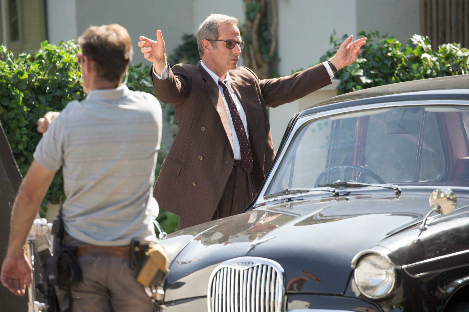 Malgré une longue journée de tournage, Robson semble encore en forme pour tourner une scène dans une voiture vintage de Singer.