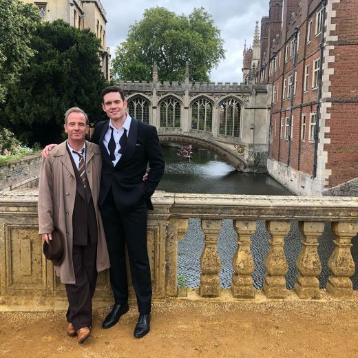 Robson et Tom Brittney sur le Bridge of Sighs pendant le tournage de deux scènes cruciales à St John's College, Cambridge.