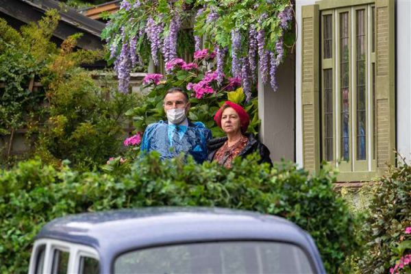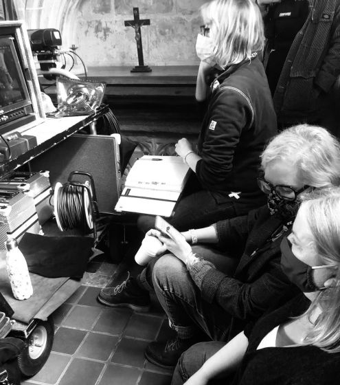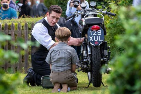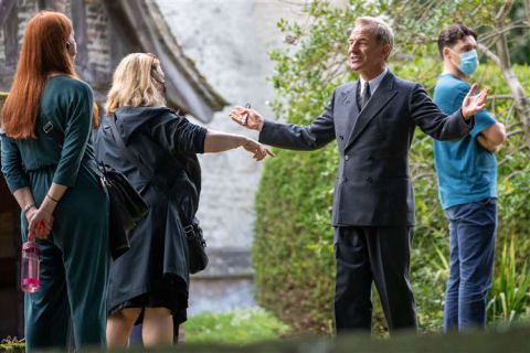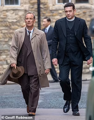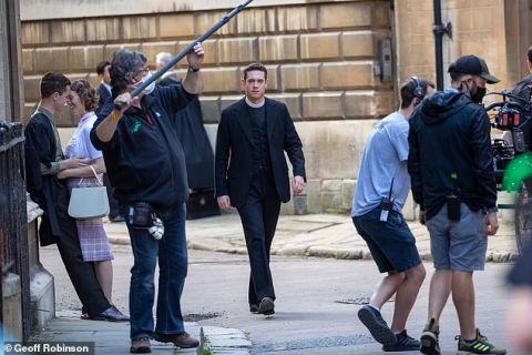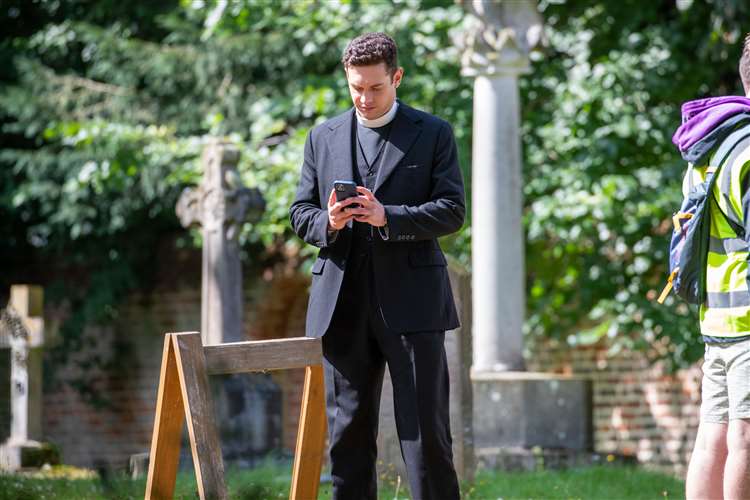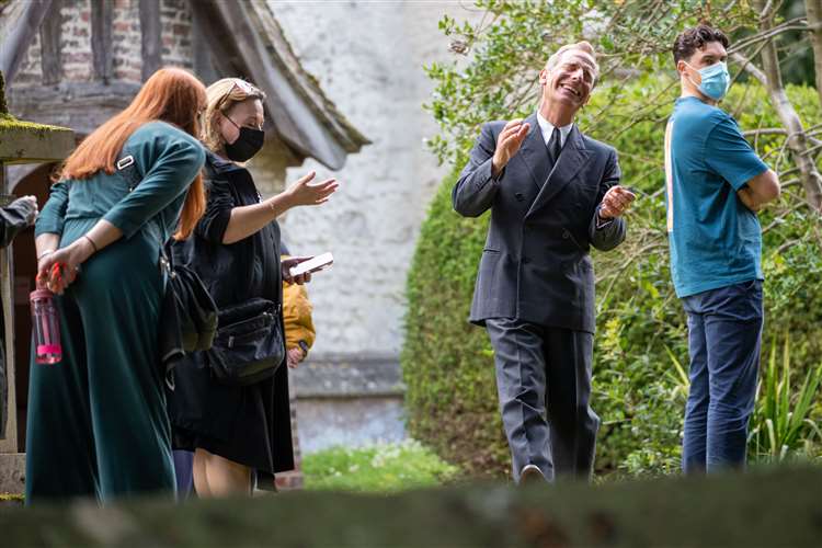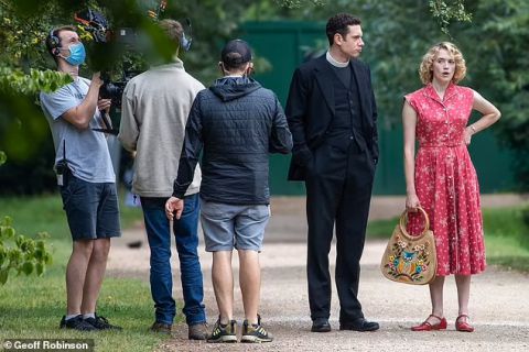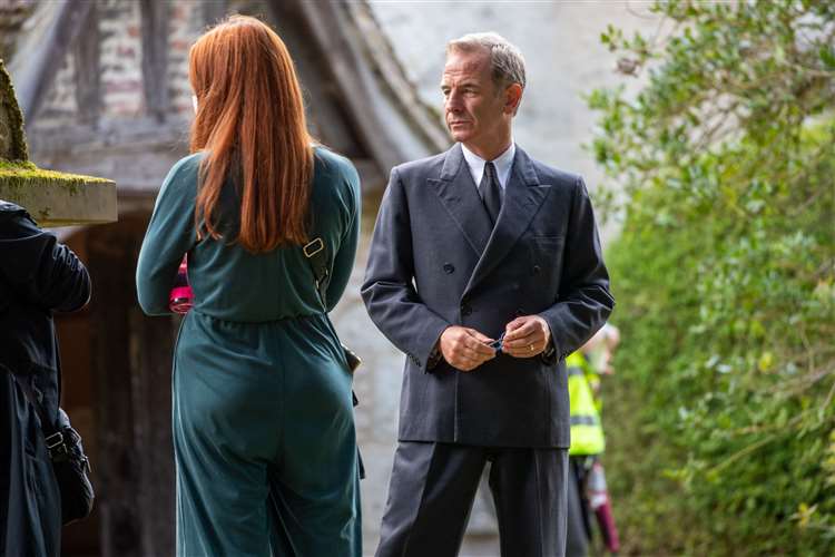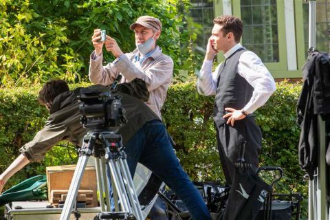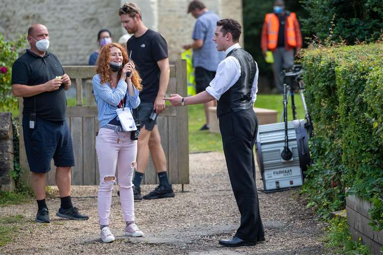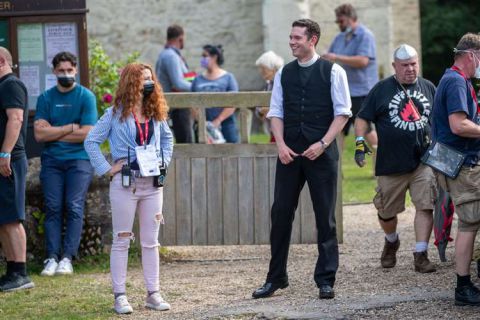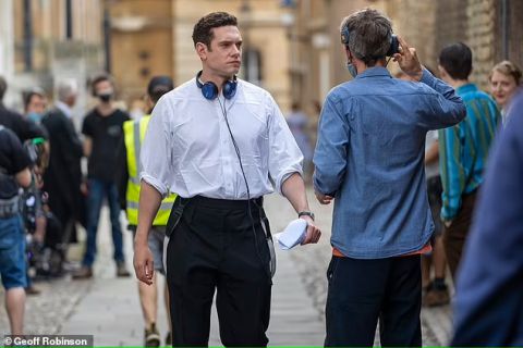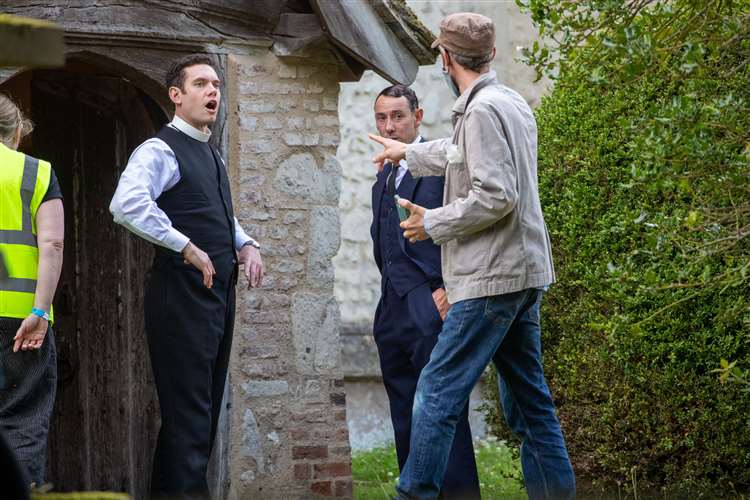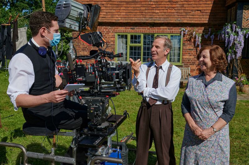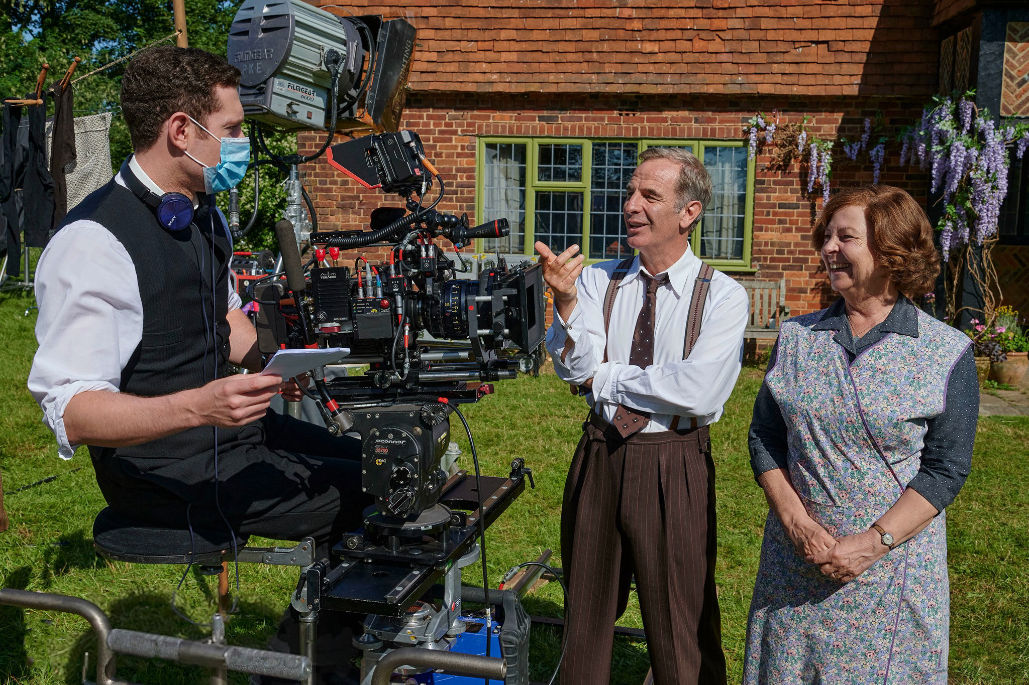 Très peu de photos ont été prises à cause de la pandémie. Cependant, des membres de la distribution et de l'équipe de tournage ont été aperçus dans le village de Grantchester en train de filmer des scènes le 14 Août 2021 (photos Geoff Robinson). Tom Brittney, 30 ans, avait commencé à tourner la première fois sur le plateau le 9 août et on le voit ci-dessous faireses débuts en tant que réalisateur.