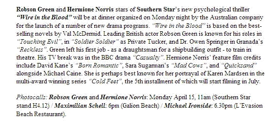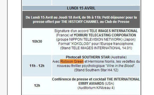La star de la télévision britannique, l'acteur Robson Green est arrivé au MIPTV pour promouvoir sa dernière série dramatique à la télévision, Wire In The Blood – dont il est également le producteur avec sa propre compagnie, Coastal Productions.