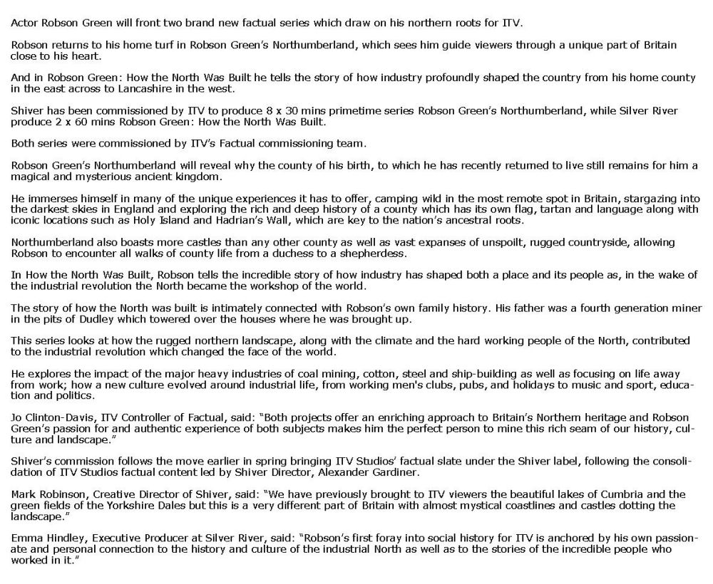 Robson Green to front two new series Northumberland and How The North Was Built – ITV Press Center