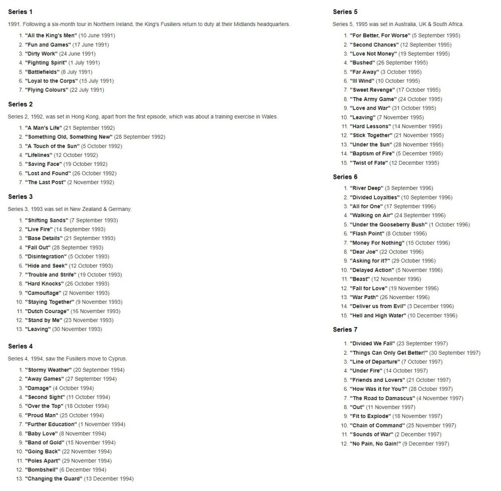 "A" Company of the King's Fusiliers are on exercise in New Zealand and are facing hostility from their local counterparts. They are soon joined by the women after an unexpected windfall. Sergeant Tony Wilton, Corporal Paddy Garvey, and Lance Corporal Dave Tucker share their experience with newcomer fusilier Vinny Bowles. But what starts out as a friendly rivalry with the Kiwis threatens to get out of hand – as does Wilton's private life. Meanwhile in Hong Kong, Nancy Garvey, Donna Tucker and the young Sheena Bowles have a surprise in store for their husbands.